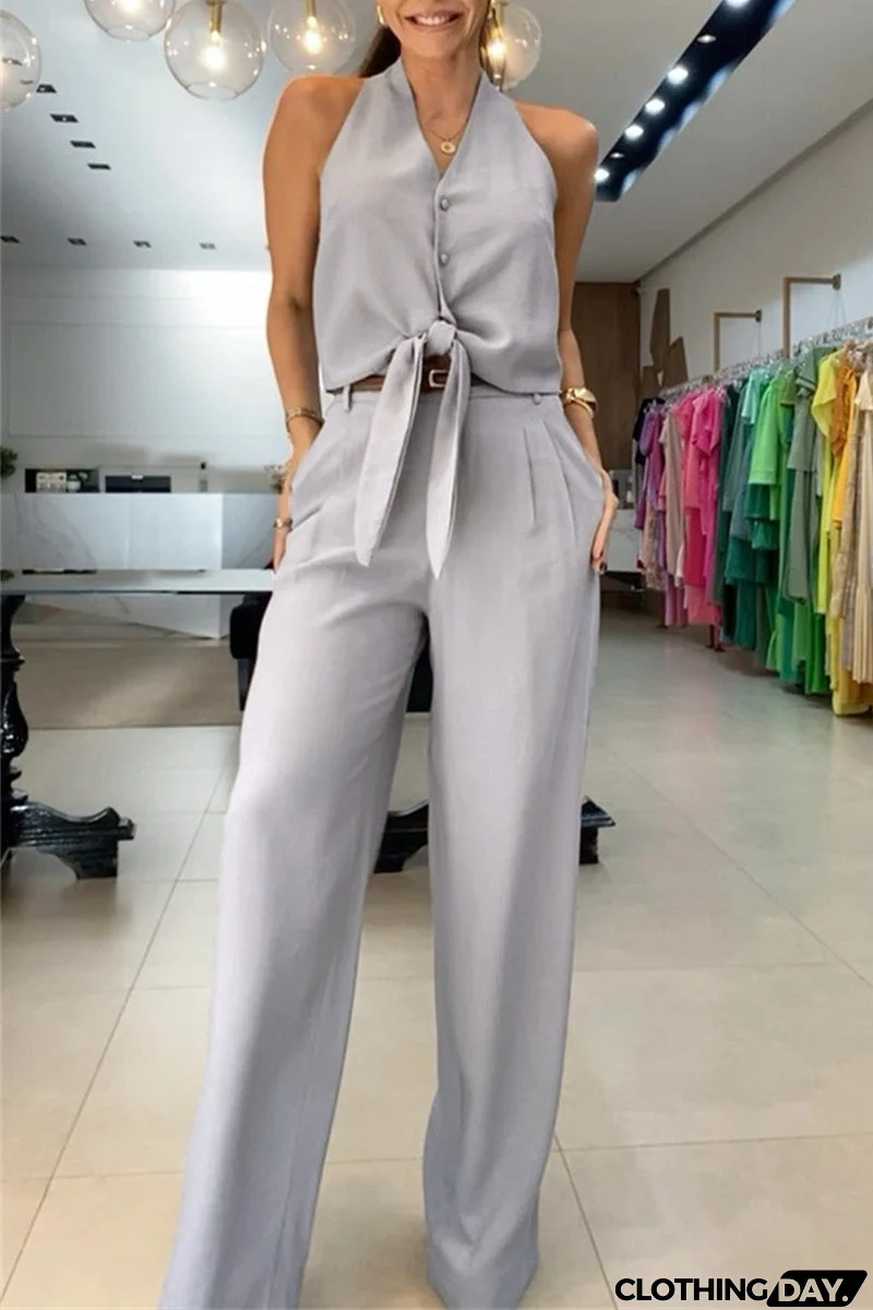 Casual British Style Solid Pocket Frenulum V Neck Sleeveless Two Pieces