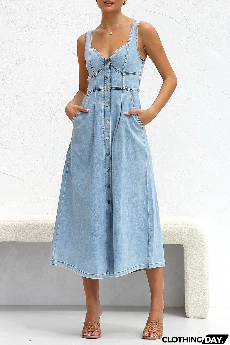 Elegant Solid Make Old Pocket Buckle V Neck Sleeveless Loose Denim Dresses