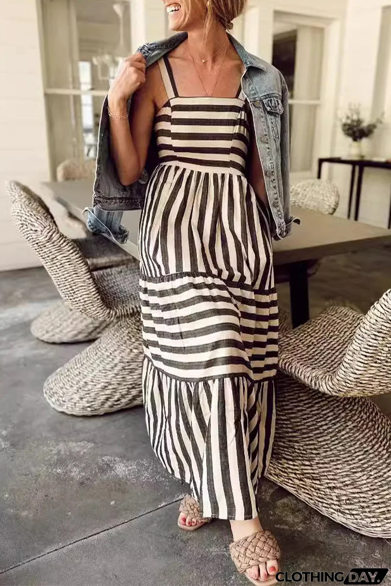 Striped Print Patchwork Square Collar Sling Dresses
